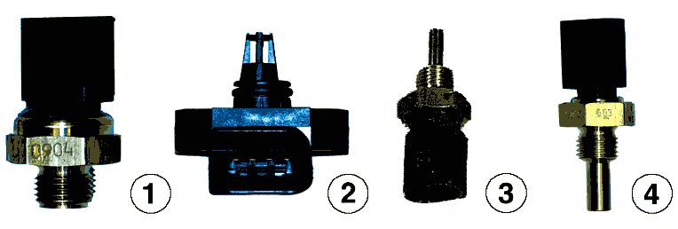 датчик температуры масла; датчик давления масла; датчик температуры топлива; датчик температуры охлаждающей жидкости; датчик давления наддува и датчик температуры воздуха наддува; датчик положения распределительного вала; датчик положения коленчатого вала; датчик уровня масла; датчик давления воздуха (внутри блока PLD). Общий вид датчиков показан на рисунке.