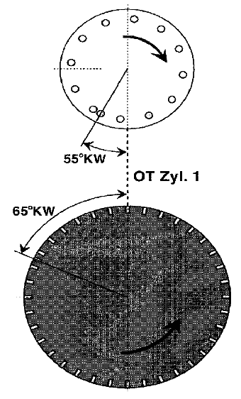 После синхронизации сигнала точку отсчета для начала впрыска дает специальный 37-ой вырез, расположенный под углом 65° перед верхней мертвой точкой 1-го цилиндра.