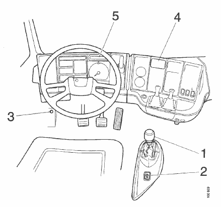 На вышеприведенном рисунке изображены управляющие устройства, используемые для системы автоматического переключения передач Opticruise. Педаль тормоза, управляющие устройства системы