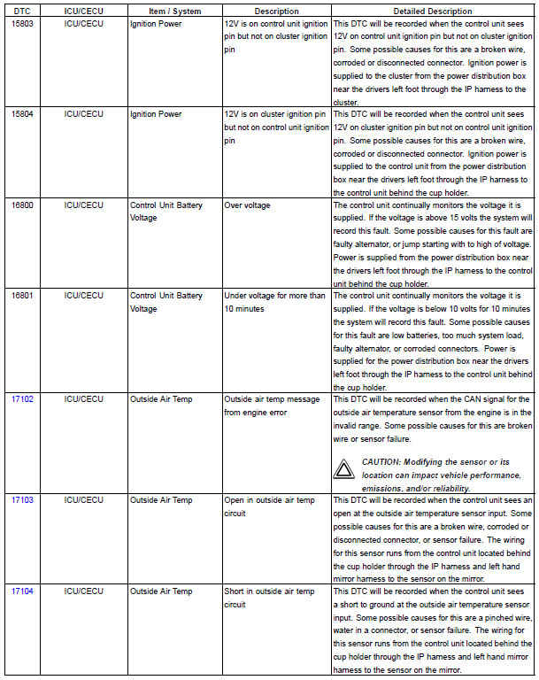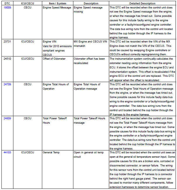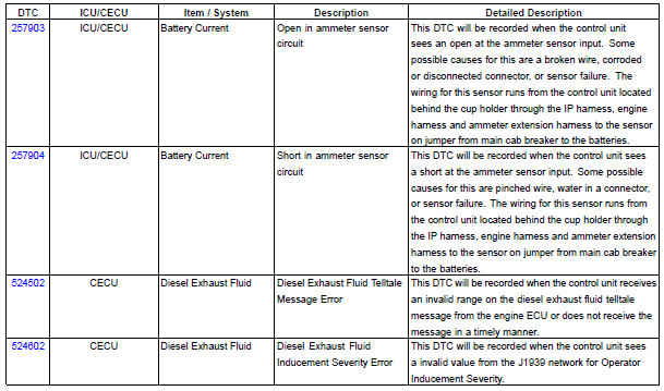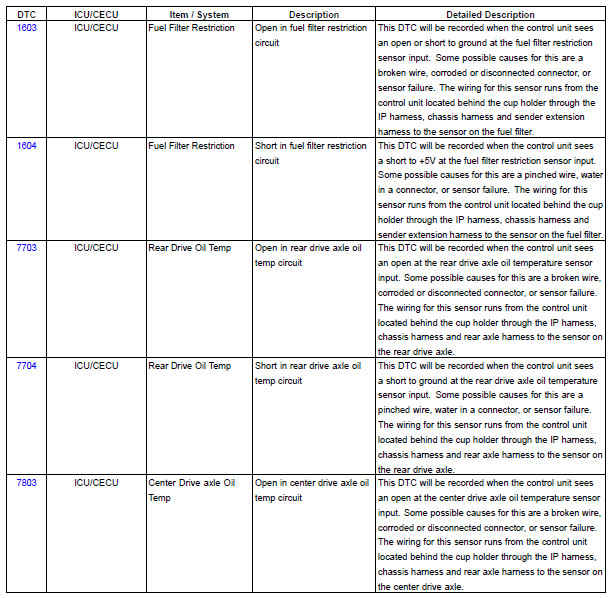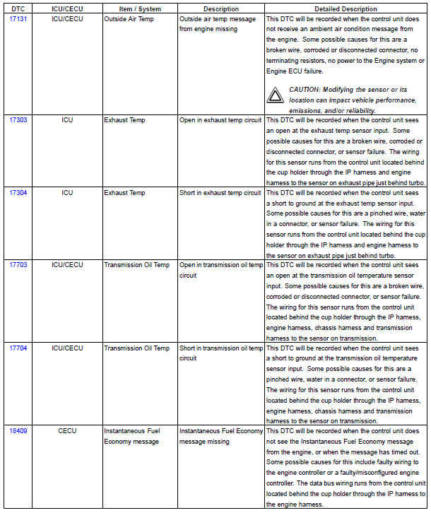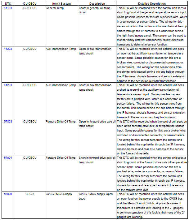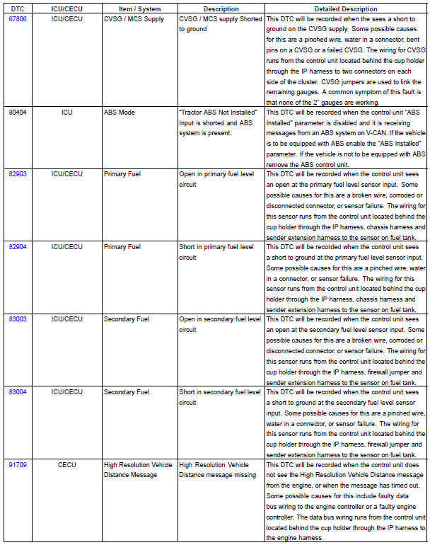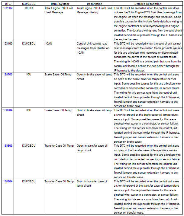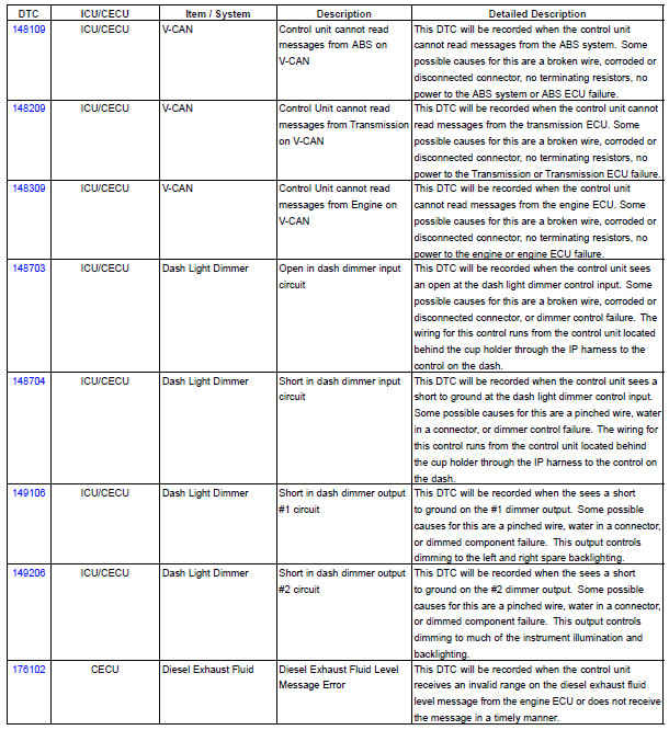 The following chart provides a listing of possible ICU/CECU diagnostic trouble codes (DTCs) and links to their corresponding troubleshooting