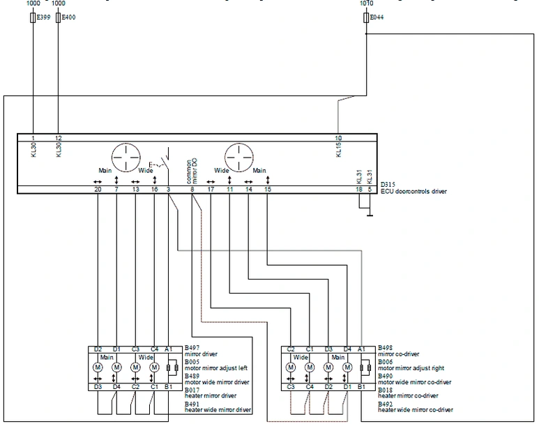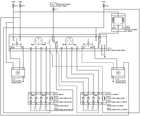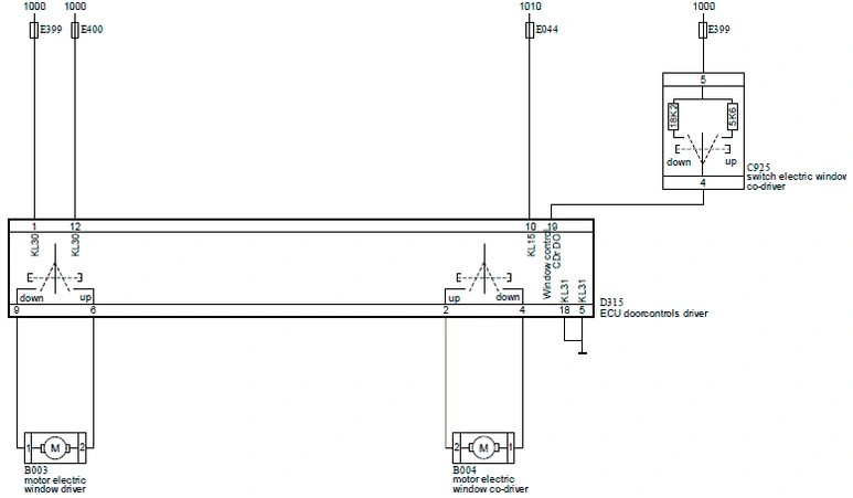 Если включить переключатель управления стеклоподъемником на модуле двери (D315), модуль двери подает питание от контакта 9 в электродвигатель стеклоподъемника со стороны водителя (B003). Контакт 6 модуля двери переключается на