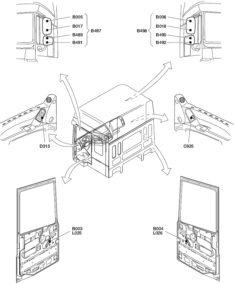 (D315), модуль двери подаст питание от контакта 2 в электродвигатель стеклоподъемника со стороны второго водителя (L026). Контакт 4 модуля двери переключается на "массу" изнутри. После этого