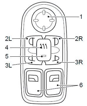 С помощью переключателей 2L и 3L выберите левое основное зеркало (2L) и левое зеркало с большим углом обзора (3L). С помощью переключателей 2R и 3R выберите правое зеркало (2R) и правое
