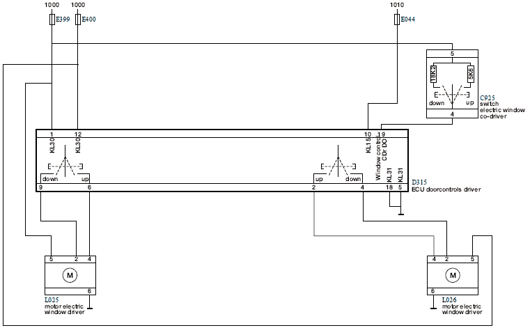 Если кратковременно включить переключатель управления стеклоподъемником на модуле двери (D315), модуль двери подаст питание от контакта 4 в электродвигатель стеклоподъемника со стороны второго водителя (L026). Контакт 2 модуля двери переключается на "массу" изнутри. После этого