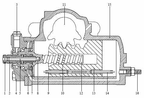 Регулировочный болт вталкивает скошенные зубья секторного вала (11) глубже в зубья поршня (13), тем самым устраняя зазор.