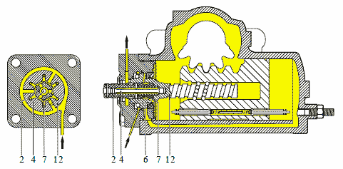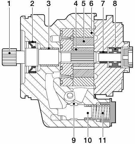 Управляющая часть расположена в крышке насоса и состоит из клапана регулирования расхода (10) с пружиной (11).