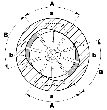 Два раза за оборот за счет эллиптической формы внутренней части статора (6) объем в каждой насосной камере увеличивается, ход всасывания (угловое смещение B), и уменьшается, ход нагнетания (угловое смещение A).