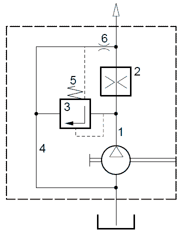 Если подача насоса не достигла заданного значения, клапан регулирования расхода (3) проталкивается в передней части до упора, тем самым закрывая внутренний циркуляционный канал (4).