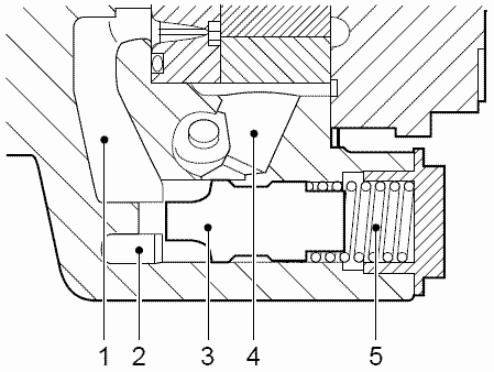 Давление пружины (5) и давление масла в калиброванном отверстии (6) в задней части клапана