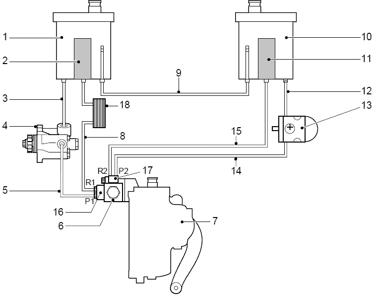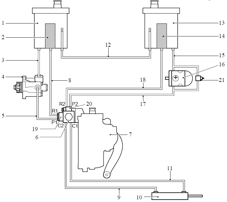 Резервуары (1) и (13) соединены перепускной трубой (12). Труба соединяется таким образом, что при наличии утечки в одном из контуров, другой контур продолжает работать.