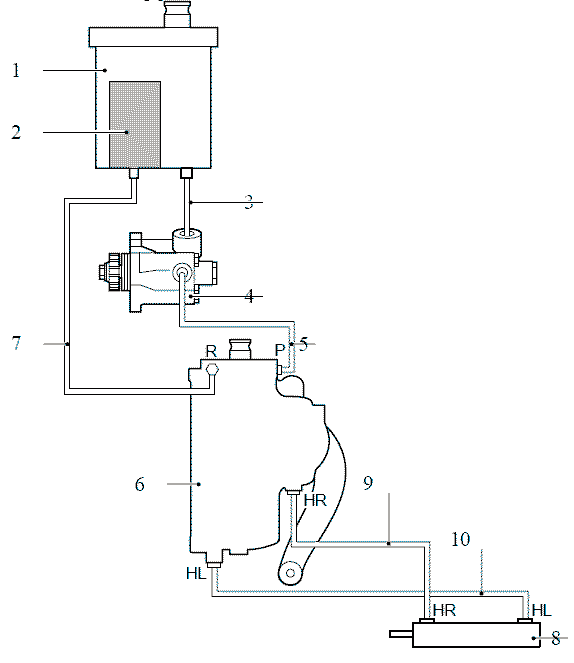 Насос рулевого управления (4) нагнетает масло через линию (5) в механизм рулевого управления (6).