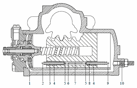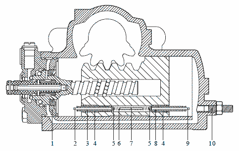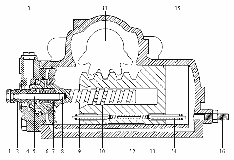 Шаровая кривая (10) преобразует вращательное движение червячного вала в линейное движение поршня (13). Зубья поршня (13) вращают секторный вал (11) с рулевой сошкой, установленной на нем.