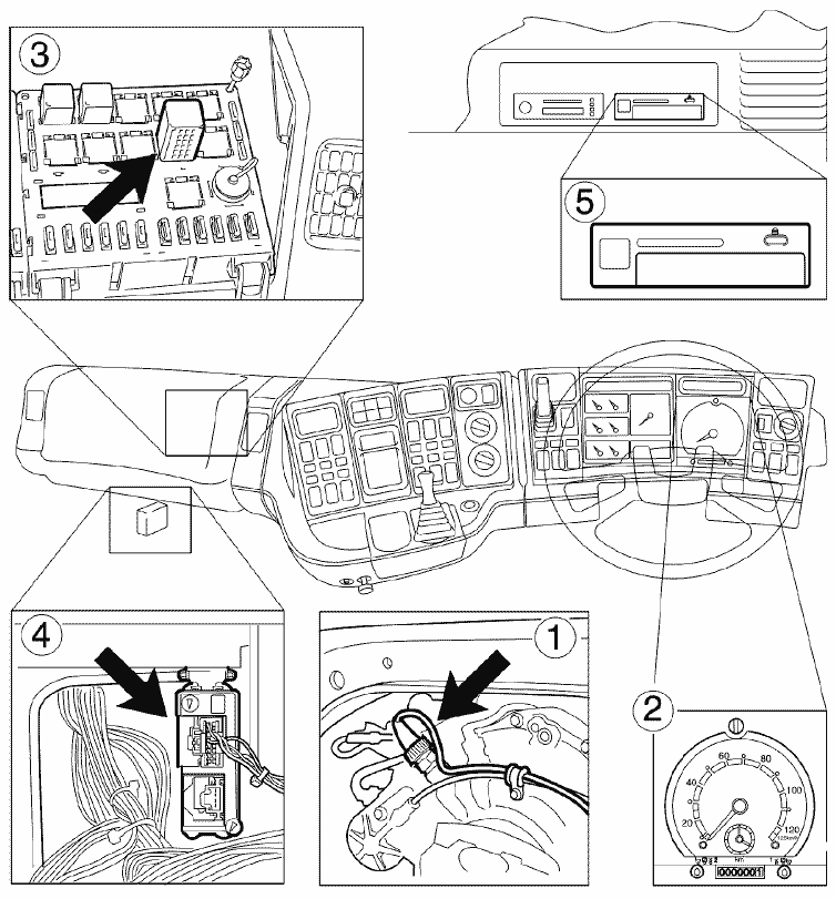 Калибровку цифрового тахографа необходимо проводить специальным оборудованием. Оно должно быть подключено через специальный разъем преобразователя импульсов, который расположен под центральным электрическим блоком. После калибровки не нужно пломбировать преобразователь импульсов, усилитель сигнала или цифровой тахограф.