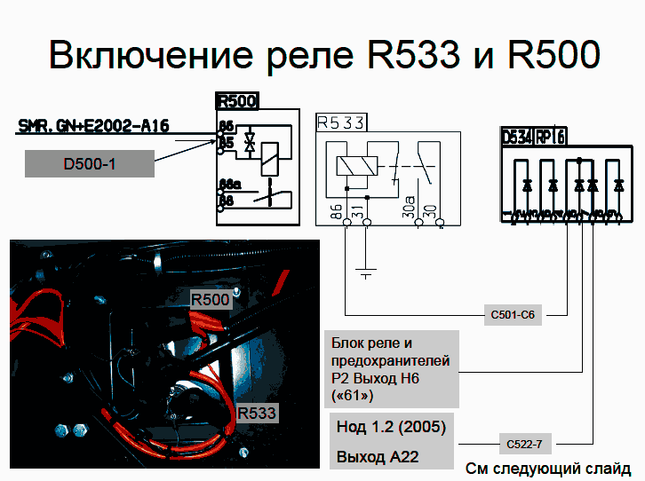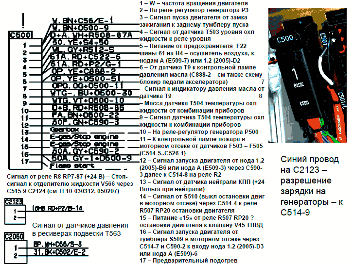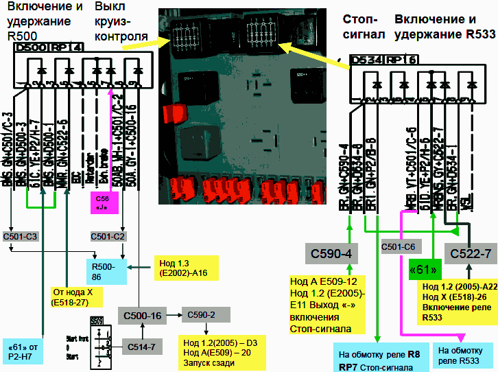 3 - Сигнал запуска двигателя от выхода нода 1.2(2005)-В6 или нода А(509)-3 на реле R2 стартера