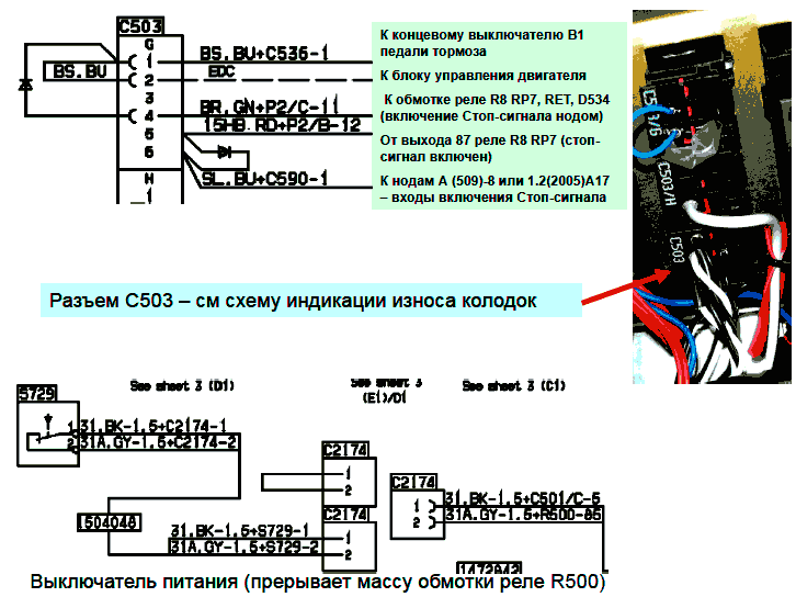 8 - Сигнал от выключателя S500 (нормально замкнут на массу) на вход нода Х (518)-17 управления реле питания