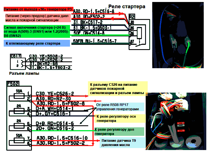 7 - Сигнал запуска двигателя (+24 В) от S509-2 тумблера запуска сзади к ноду A(509)-6(BNS1) или 1.2(2005)-D3 (BNS2)