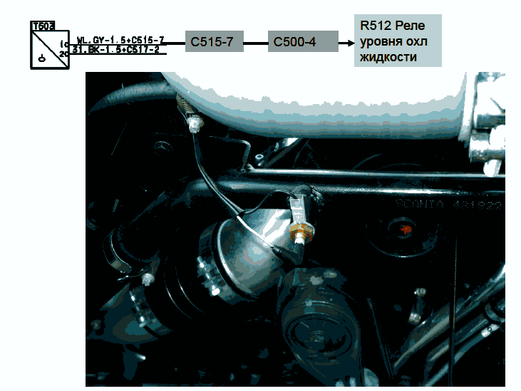 7 - Сигнал от датчика Т503 уровня охлаждающей жидкости к реле уровня R512 RP34
