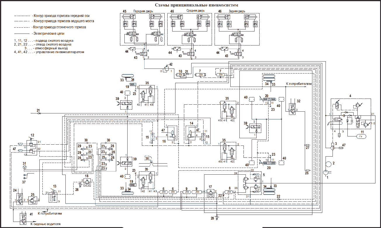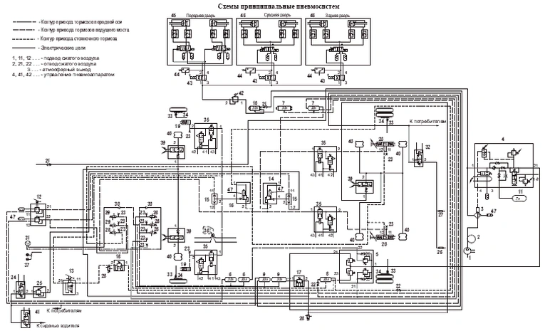 Принципиальная схема пневмосистем автобуса МАЗ 103