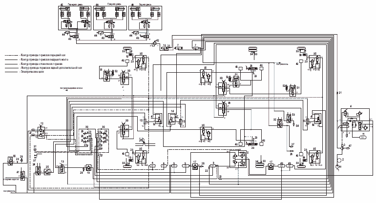 секции; 41 ‑ тормозные камеры II секции; 42 - ускорительный клапан тормозов II секции; 43 ‑ ресиверы тормозов II секции;