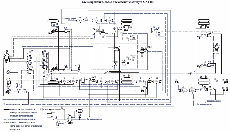 Схема принципиальная пневмосистем автобуса МАЗ 105