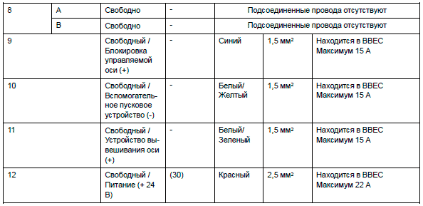 Провода от контактов 9 -12 предварительно проложены до разъема BBEC1 в центре электрооборудования изготовителя кузова в кабине. К этому разъему можно подключать провода необходимых систем.