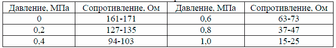 Таблица 8 Зависимость величины сопротивления датчика от давления.