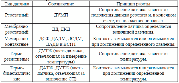 Датчики реостатного типа, сопротивление зависит от положения поплавка.
