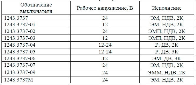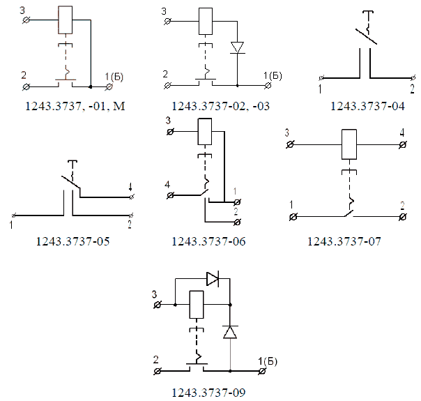 Обозначение контактов. Выводы 1 и 2 – силовые, вывод 4 – вспомогательный (для выключателей 1243.3737-05 и 1243.3737-06), вывод 3 – электромагнита.