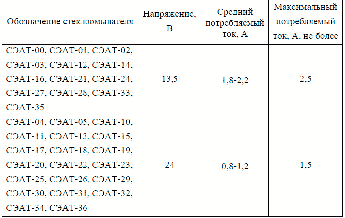 Таблица 17 Рабочие напряжение и потребляемый ток стеклоомывателей