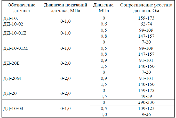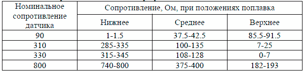 Для проверки датчиков реостатного и мембранно-реостатного типа достаточно определить сопротивление в 2-3 точках положения движка реостата (2-3 положения поплавка, 2-3 значения давления). Однако при наличии провалов (резкое увеличение или снижения показания приборов) требуется дополнительная проверка изменения сопротивления при плавном изменении положения поплавка или давления.