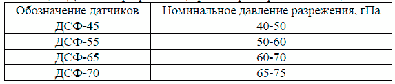Таблица 4 Давление разрежения, при котором срабатывают датчики.