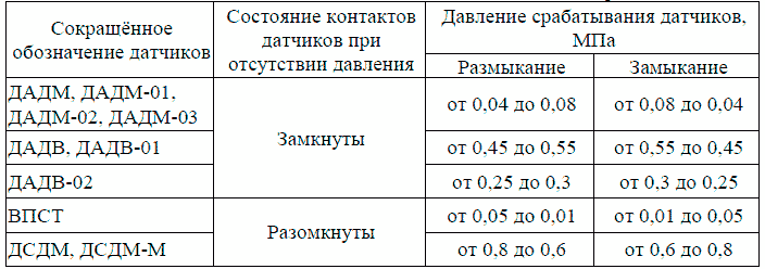 Таблица 6 Состояние контактов датчиков и величина давления срабатывания.