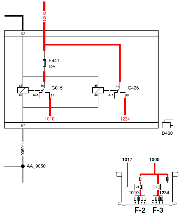 Питающие провода 1000 и 1017 подсоединены к центральному блоку (D400).