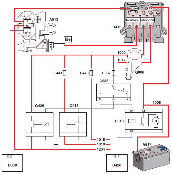 Провод от клеммы стартера подключается к блоку распределения питания (D) на двигателе. От блока питания провода 1000 и 1017 подключаются через систему распределения питания в кабине (E) к