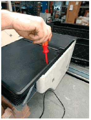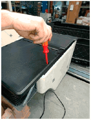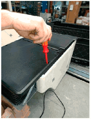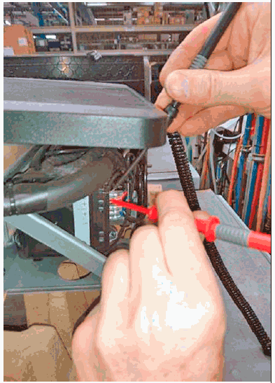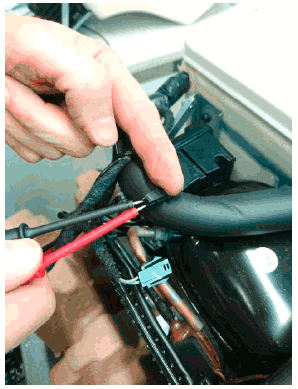 Напряжение АКБ измеряется между двумя верхними подключениями электронного блока компрессора кондиционера (черный = минус, красный = плюс). Напряжение АКБ должно составлять не менее 24,2 В.