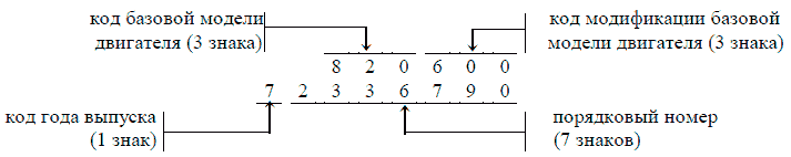 Маркировка содержит коды базовой модели и модификации базовой модели, код года выпуска и порядковый номер двигателя.