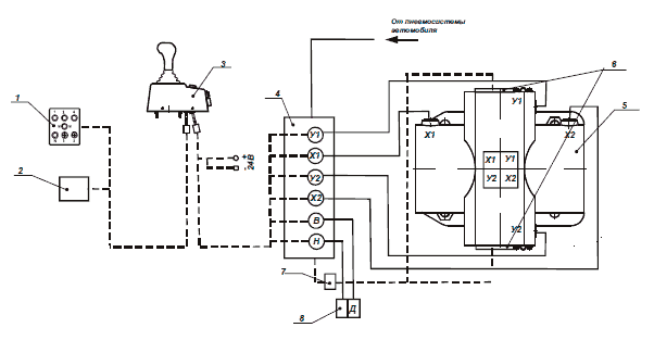 1 - блок индикации, 2 - датчик сцепления; 3 - задатчик режимов движения; 4 - блок клапанов(БК-6); 5 - механизм исполнительный; 6 - блок крышек; 7 - разъем блока крышек; 8 - делитель.
