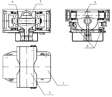 Корпус МИ состоит из двух пневмоцилиндров (1) диаметром 80 мм и двух пневмоцилиндров (2) диаметром 40 мм, расположенных перекрестно.