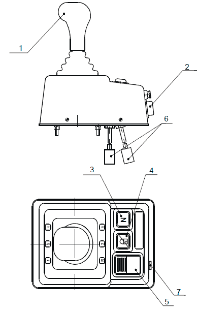 1- рычаг; 2 - клавиша включения питания; 3 - кнопка принудительной нейтрали; 4 - кнопка снятия блокировки; 5 - делитель; 6 - разъемы для присоединения кабелей; 7 - зуммер