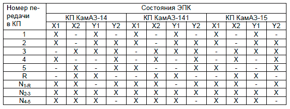 Состояния ЭПК при включении передач для различных моделей коробок пере-дач приведены в таблице ниже.