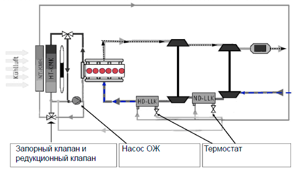 Вода из контура охлаждения переводится в низкотемпературный охладитель через магнитный клапан. Вторично охлажденная вода проводится затем через два охладителя воздуха наддува, а затем снова направляется в контур охлаждения. Два охладителя воздуха наддува (низкого и высокого давления) регулируются с помощью быстро открывающихся термостатов.