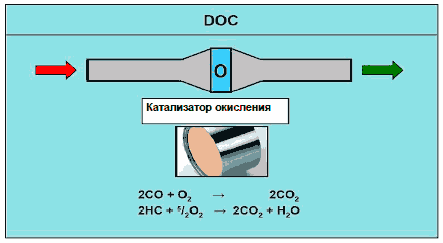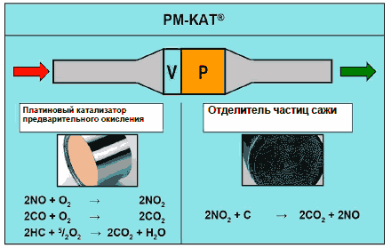 Удерживаемые частицы сажи вступают в реакцию при высоком давлении и высокой температуре ОГ (мин. 250°C). Частицы сажи разрушаются в результате постоянной химической реакции с диоксидом азота (NO2), результат реакции выпадает в осадок.