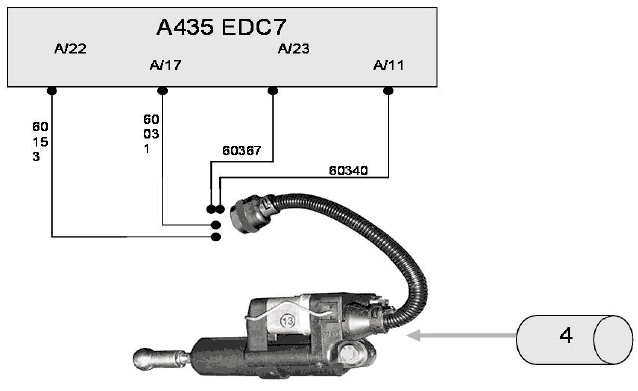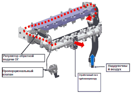 Двигатели Euro4/5 оснащены отрегулированной рециркуляцией ОГ (электрическая система рециркуляции ОГ). Пропорциональный клапан, который вместе с пневмоцилиндром контролирует положение заслонки системы рециркуляции ОГ, управляется широтно-импульсным модулированным сигналом (PWM), датчик смещения контролирует текущее положение крышки системы рециркуляцией ОГ.