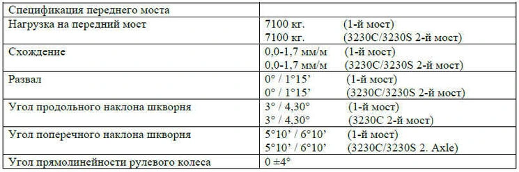 Углы установки колес передних мостов должны быть измерены и отрегулированы с помощью измерительного инструмента в соответствии с данными спецификации Таблицы.
