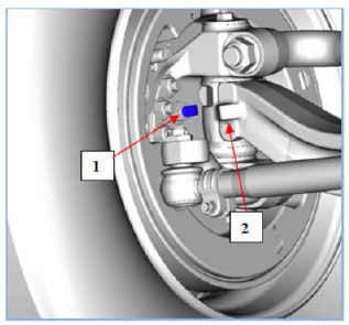 • Измерьте с помощью щупа и запишите расстояние зазор между ограничительным болтом 1 и упором на балке моста 2 как показано на (Рис. ниже).