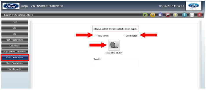 - Пропишите информацию об установке сцепления в блок управления коробки передач. Для этого установите галочку «New clutch», если на автомобиль было установлено новое сцепление, или галочку «Used clutch», если на автомобиль было установлено снятое с автомобиля сцепление, в разделе «Clutch Installation» блока AMT. После этого нажмите кнопку «Install the Clutch».