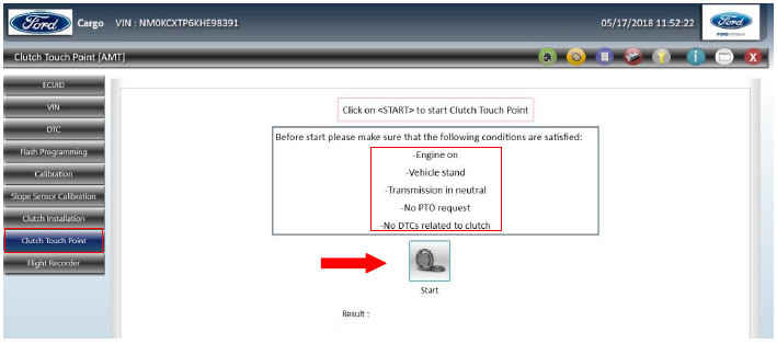 - Запрограммируйте рабочую точку сцепления, нажав кнопку «Start» в разделе «Clutch Touch Point» блока AMT.
