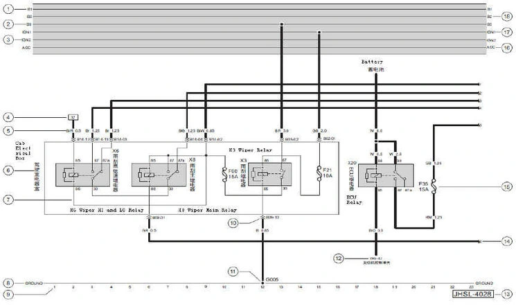 - B2: representing the power line which supplies power to cab electrical box through electrical box fuse SF03 of chassis
