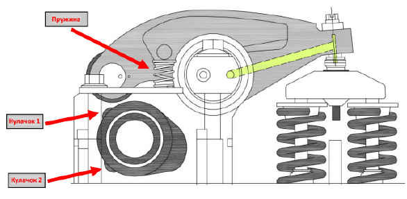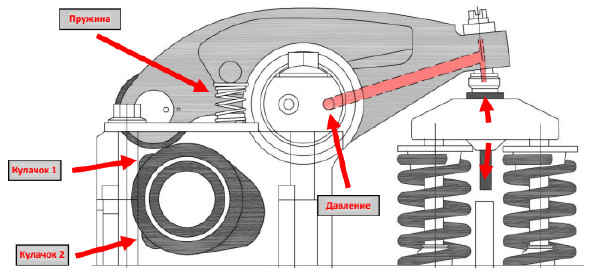 касаются ролика коромысла. В результате, движение не передаются на клапаны, см. рис.