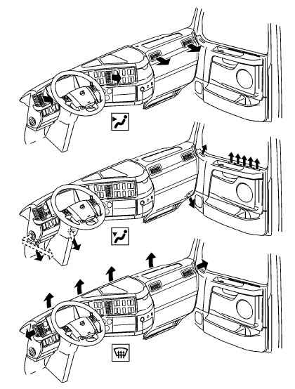 Воздух выходит из кабины через выпускные вентиляционные отверстия в дверях и через задние стойки кабины. Воздух на впуске проходит от ветрового стекла вверх в потолок, вниз вдоль задней стенки до пола, вверх между отделкой стенки и панелью и, наконец, через вентиляционные отверстия сзади кабины. Эта вентиляционная система удаляет холод с задней стенки, что особенно важно в кабинах со спальным местом. Невозвратные клапаны в вентиляционных отверстиях вытяжки воздуха предотвращают возможность потока воздуха в другом направлении через вентиляционные отверстия, и имеют параметры, позволяющие создавать небольшое положительное давление внутри кабины с целью предотвращения попадания воздуха снаружи.